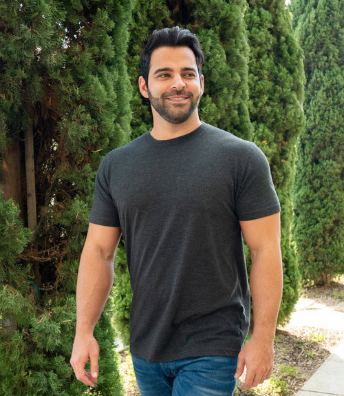 Jarret is wearing the Charcoal Crew Neck Tee with proprietary Stratusoft Fabric | Fresh Clean Threads Canada