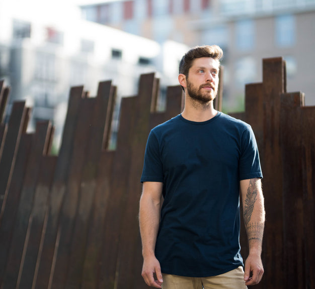 Model wearing Navy Blue Crew Neck from the Summer Basics 5 - Pack with proprietary Stratusoft fabric | Fresh Clean Threads Canada